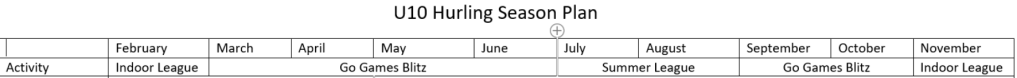 3.) Short Term Planning: This is breaking each yearly program down further to a more specific block which caters for the needs of the players. For younger ages, the season can be much the same with no championship to focus on, it allows a smoother progression from the start of the year to the end. As teams get older, they may try to peak a number of times throughout the season e.g. at U14 level, the manager might try to ensure the team is peaking for Feile in May and again for Championship in August. For an adult team who may need to peak in April for the first round of championship and again in August/September, they may also need to be more conscious of the events in the year. Here is how a season for an U10 Hurling team might be broken up. Identifying the games and the differing rules may allow the coach to plan a little more appropriately.