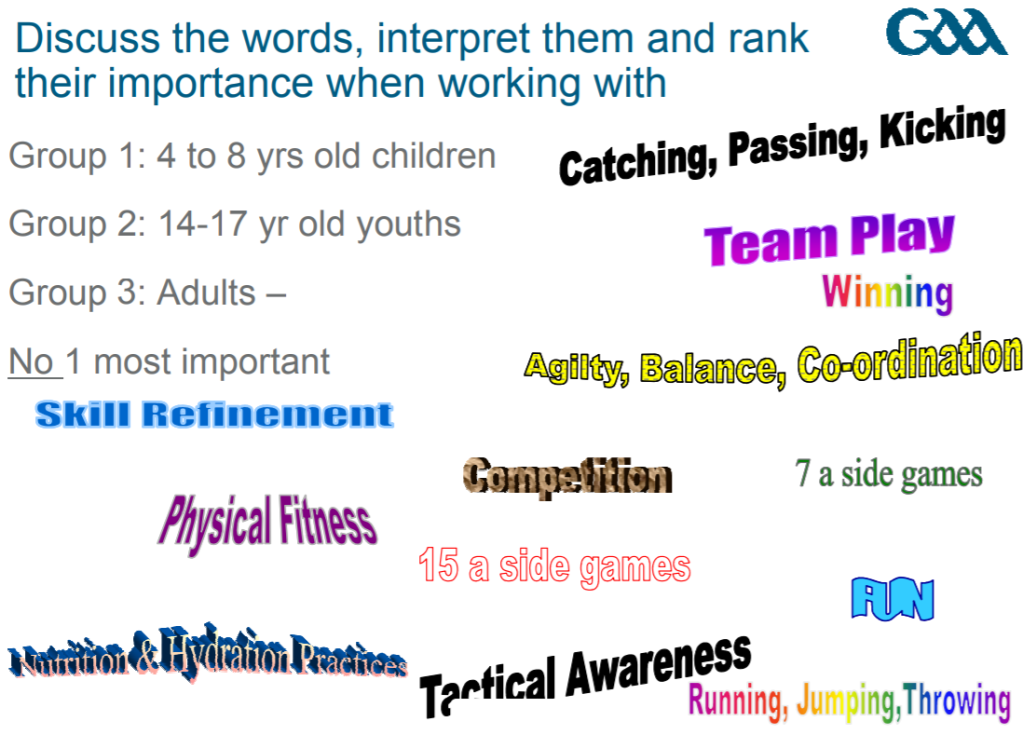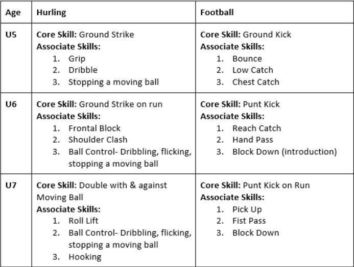 If a coach was to introduce 3 new skills, along with the Core skill each year, by the age of 10 a child would of been given an introduction to each skill needed to play Hurling and Football. It is also important to set a level of appropriate physical development program, be that Fundamental movement with the Nursery group or introduction to body weight exercises for older players, progressing onto weights further on.